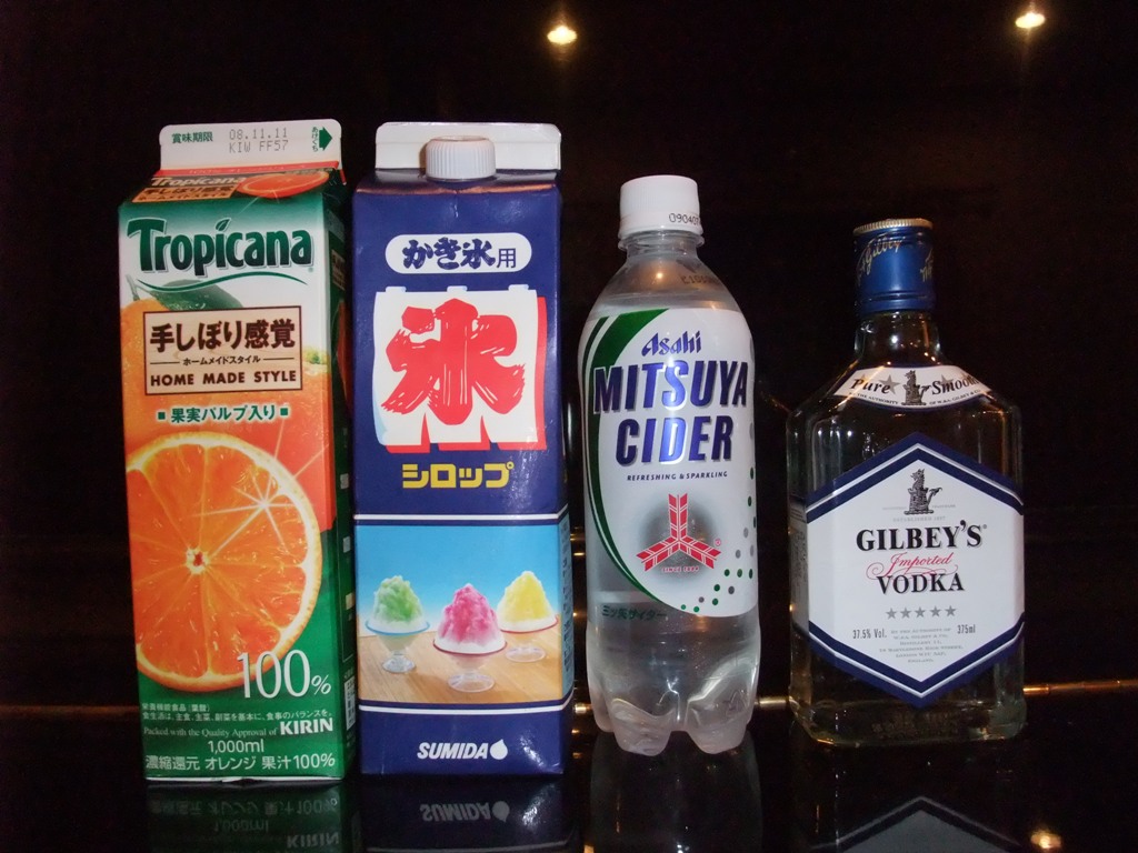 ②サイダー(炭酸水):100%オレンジジュース:ウォッカ=4:1:1で入れる。